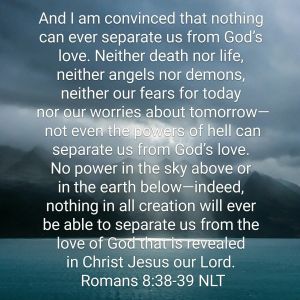 Romans 8:35-39 (NLT) – 35 Can anything ever separate us from Christ’s love? Does it mean he no longer loves us if we have trouble or calamity, or are persecuted, or hungry, or destitute, or in danger, or threatened with death? … 37 No, despite all these things, overwhelming victory is ours through Christ, who loved us. 38 And I am convinced that nothing can ever separate us from God’s love. Neither death nor life, neither angels nor demons, neither our fears for today nor our worries about tomorrow—not even the powers of hell can separate us from God’s love. 39 No power in the sky above or in the earth below—indeed, nothing in all creation will ever be able to separate us from the love of God that is revealed in Christ Jesus our Lord.