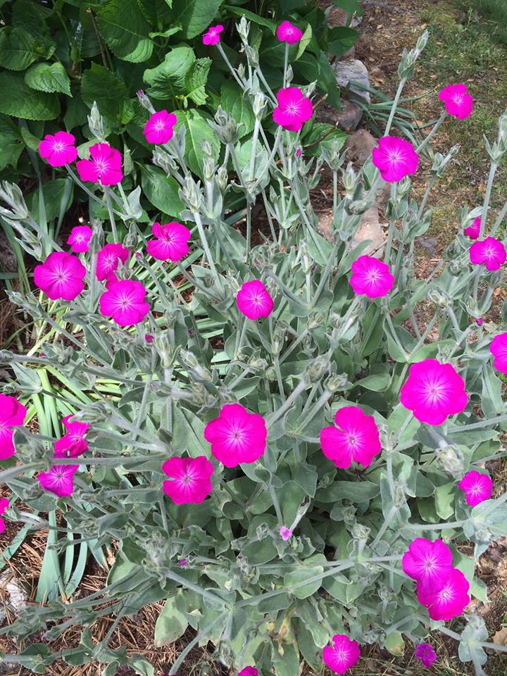 Campion Rose (Lychnis coronaria). They spread easily and are similar in behavoir to foxgloves in that the leafy plant forms in year one and the blooms follow on the stems in year two. Like foxglove, Lychnis spreads seeds by the thousands. We try to keep them on the backside of our garden between the rocks. Each year we have to remove hundreds of small plants to keep them from overrunning anything in their path. These plants don’t require much care at all and bloom profusely for several weeks. They thrive in direct sunshine but will also bloom in partial shade.