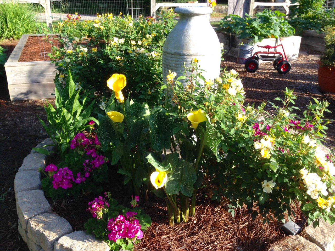 The water feature in the round raised bed is complemented by yellow knock out roses, yellow and white calla lilies and annual pink geraniums.