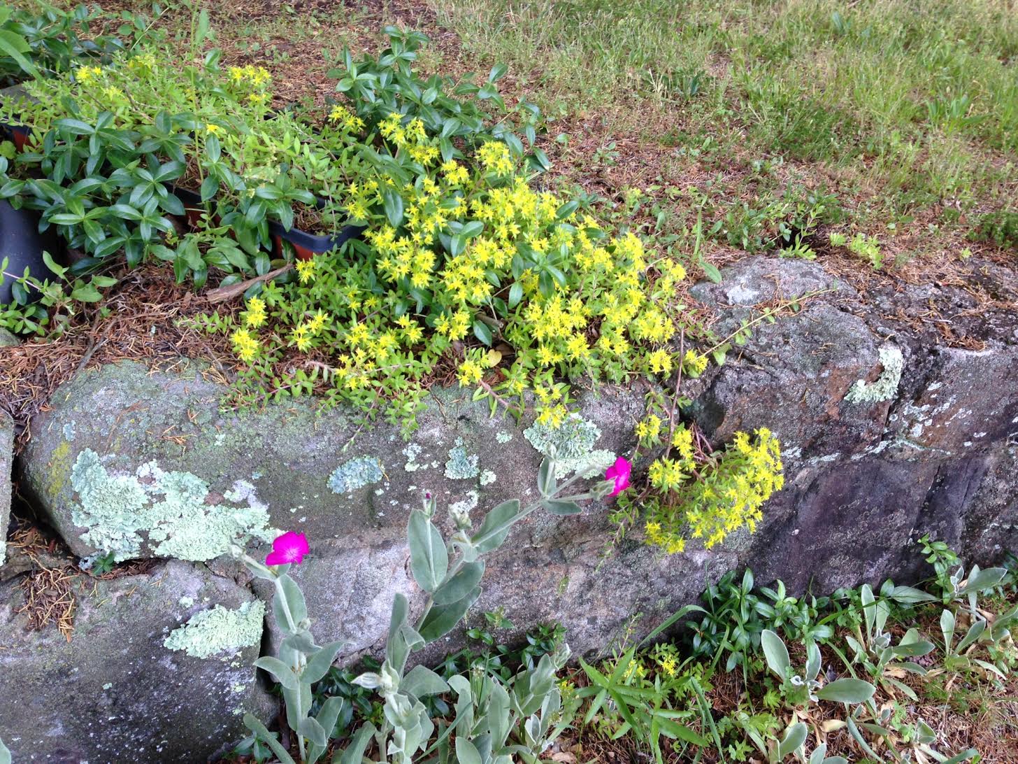 2015 Yellow ground cover growing on rock wall How can you have a bad day when God has provided so much beauty all around us? This low growing ground cover finds a way to bloom … Even when totally neglected. It is a perfect compliment to the rock wall that was built nearly 100 years ago located in front of our raised bed garden.