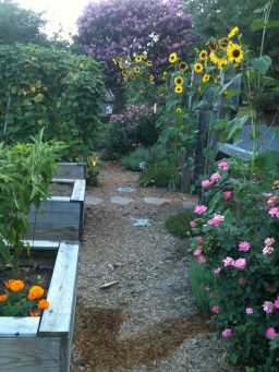 In the foreground is one of our two round raised beds set aside for summer flowers.  In the background is our garden shed.  This building was built in the 1930’s and served as a garage for my great-grandfather.  We kept the shell of the garage the same as it was before, put a new tin roof and added vinyl siding, new windows and shutters to spruce it up.  On the inside we built 24 inch shelves on both sides of the shed to organize our garden supplies and tools.  Charlotte had a potting bench constructed  to place on the side of the shed.  We have an outside sink with running water for potting plants before and pre-washing vegetables before we take them into the house for further processing.