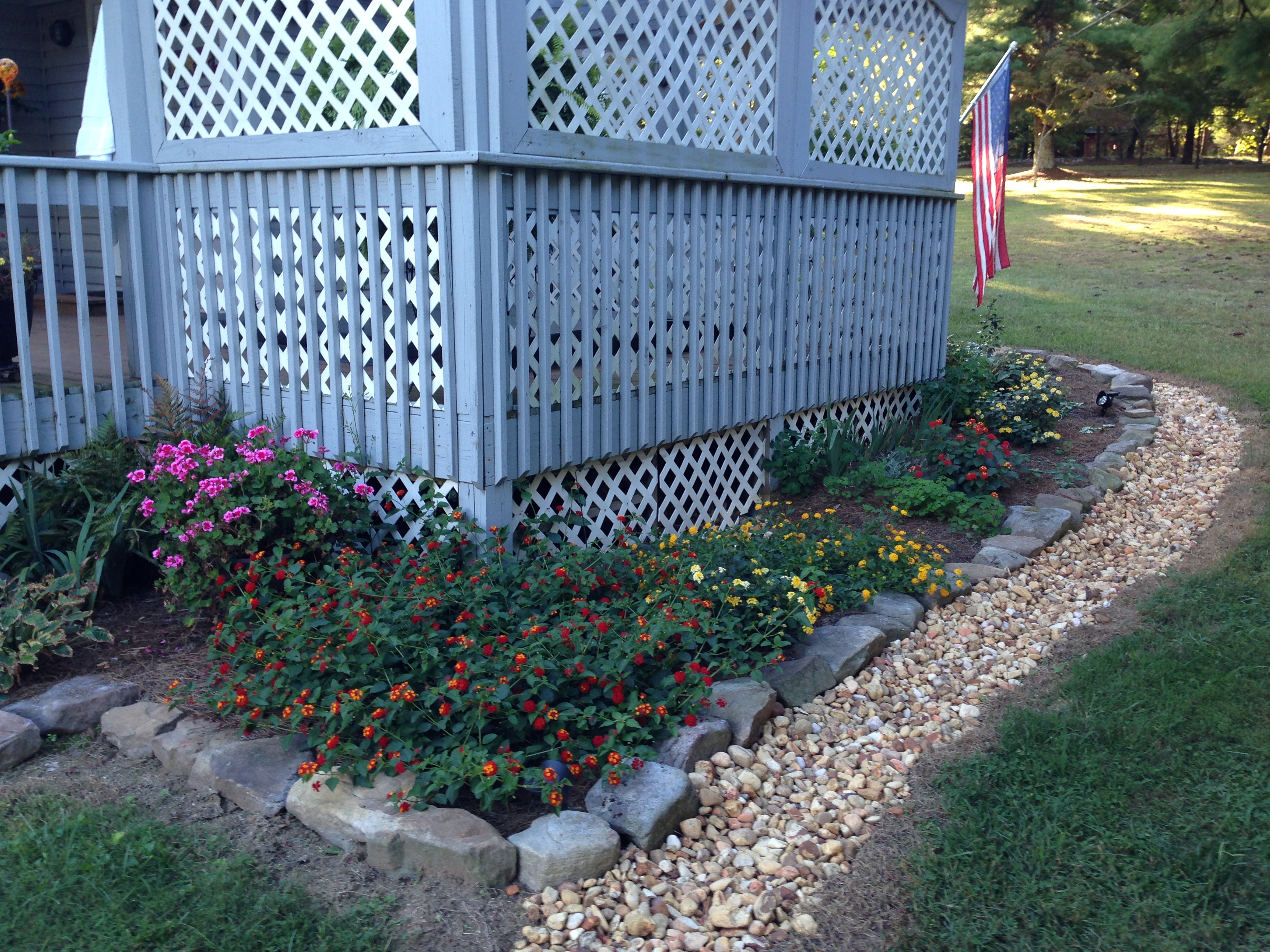 This year we added a new flower bed at the back of our deck.   This bed is for perennials only and we included Iris, Bee Balm, Blanket and Cone Flowers.  The rocks were collected from a location on our property where an old home place for Jim’s paternal Grandmother still stands.  The rocks were originally used by Jim’s grandparents to outline a portion of their flower and vegetable garden … long since grown over, but now re-used in accordance with their intended purpose begun in the early 1900’s.
