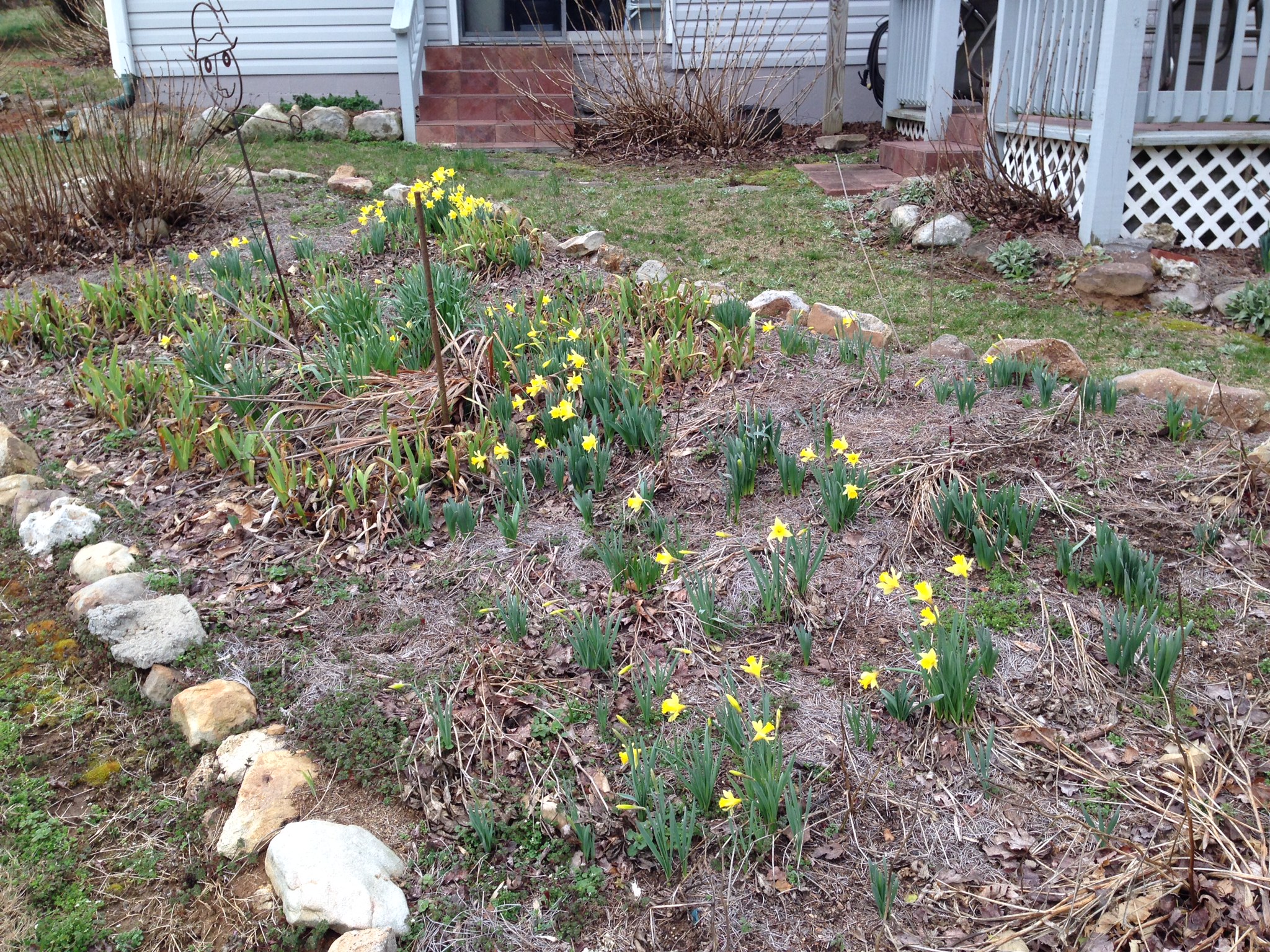 Scattered daffodils are a sure sign that spring is not far away – photos taken Mar 12. This is actually the same bed that contains the Iris and Peonies in the photo above.