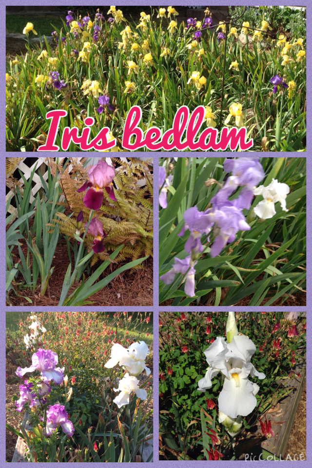 We have Iris in a number of beds around the property. The purple and yellow ones together are among our favorites. The ruffled purple and white are also real beauties.
