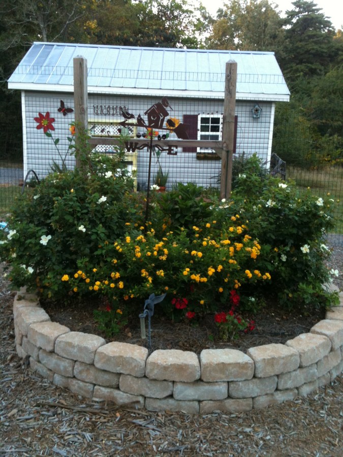 Circular raised flower bed with Garden Shed in background.