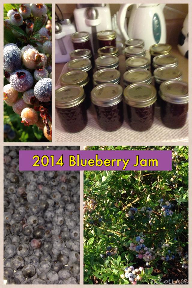 Our blackberries, grapes, apples, blueberries, plums 2014 Blueberry Jam Collageand figs are used for jellies, jams, sauces and such.  We often freeze small batches of blackberries, blueberries and figs until we accumulate enough fruit for processing.