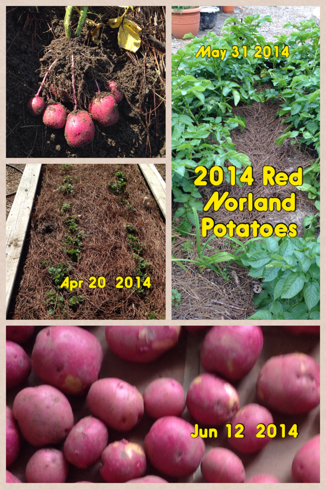 Among the veggies we enjoy the most from our raised bed garden are the Red Norland Potatoes.  This particular variety is well suited for the smaller garden and does great in the beds.  Basically you prepare the soil and bury the seed potato (usually cut in half) with the sprouts (eyes) facing upward.  It is best to have at least two sprouts on each starter potato.  This year we planted two beds … one the last week of February and the second one in late April when the above ground leaves for the first planting were emerging (middle left). Staggering the planting will allow us to stagger the harvest.  It takes between 90-100 days for the potatoes to mature.  The pictures here are of the first bed.  Once the tops start to yellow and fall over then it is time to check the underground progress.  The first box was ready to harvest around June 10 (see photo at upper left).  The potatoes are perfect for baking, boiling, frying (along with onions) and mashing.  Our 4’x8′ bed produce 25 pounds of potatoes each … that will do us nicely for quite some time.  We keep most of them in a cool dark place.  Some we will cut up and freeze for quick preparation of hash browns.