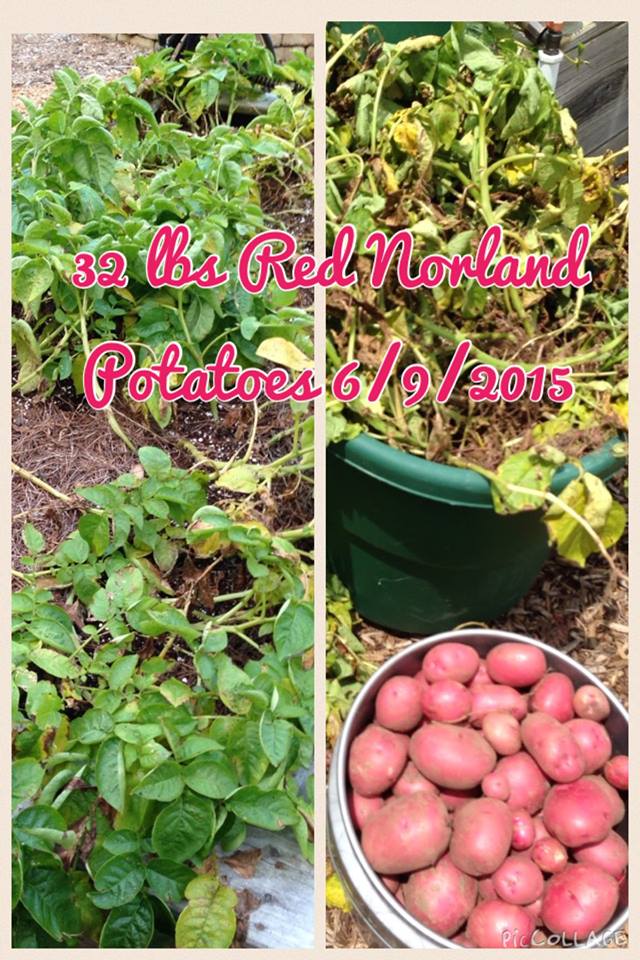Harvested June 9- delicious Red Norland Potatoes … 32 pounds from one 30 sq ft bed … 34 pounds from a 32 sq ft bed – planted 3/7/2015 … they filled a 5 gallon bucket. Love this little garden!