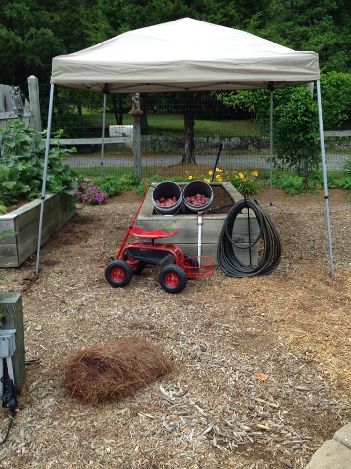 Put up your tent for shade, scoot around the raised bed on your garden scooter and store your potatoes in a five gallon bucket conveniently located at the rear of the scooter ... Now that's the way to garden in the blazing sun!