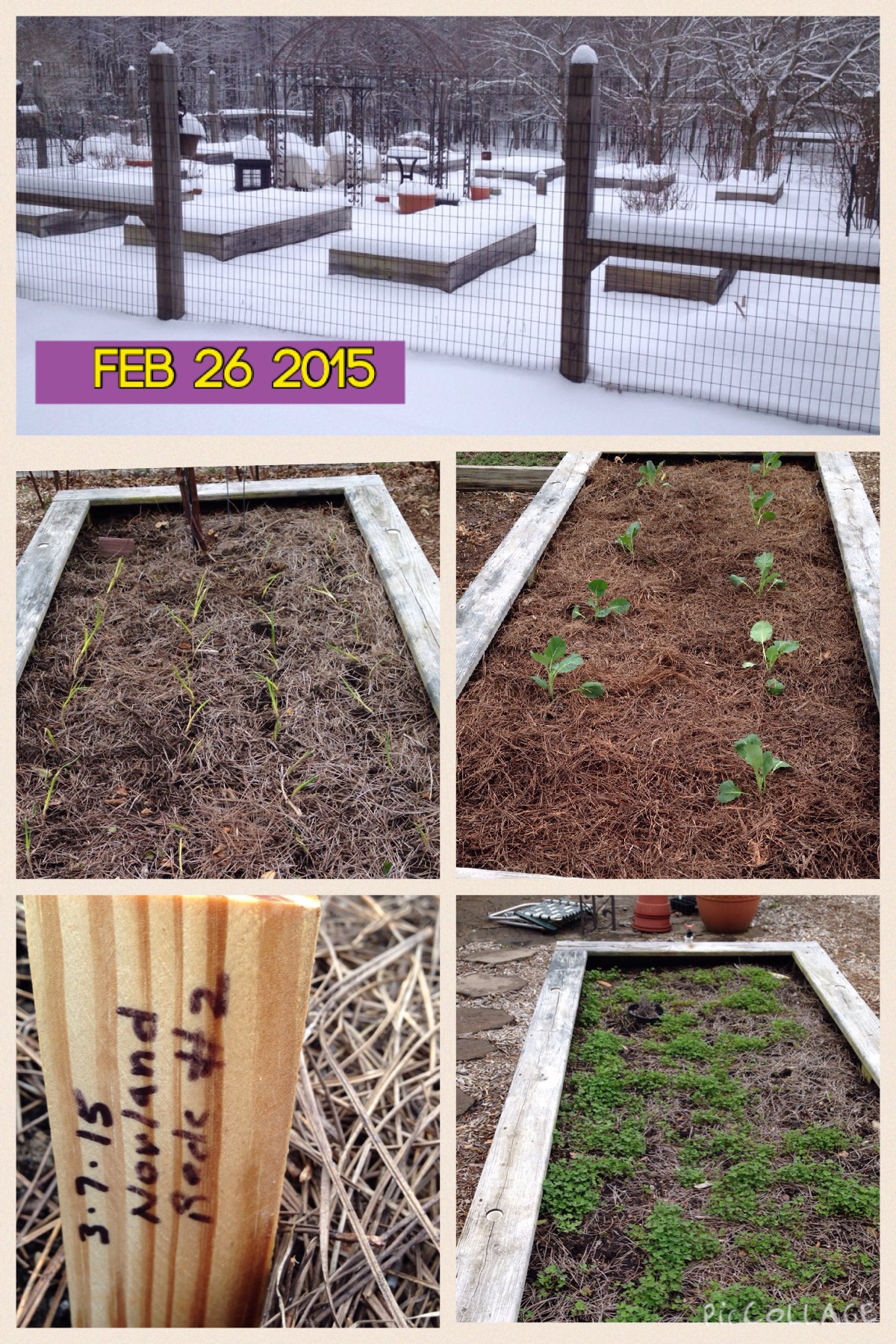 Top - 7-8 inches of snow on February 26 covers the garden Middle Left - planted mustard greens from seeds on Mar 7 Middle Right - Georgia Collards planted Mar 7 Lower Left - Red Norland Potatoes planted Mar 7 Bottom Right - Red Clover planted late October 2014