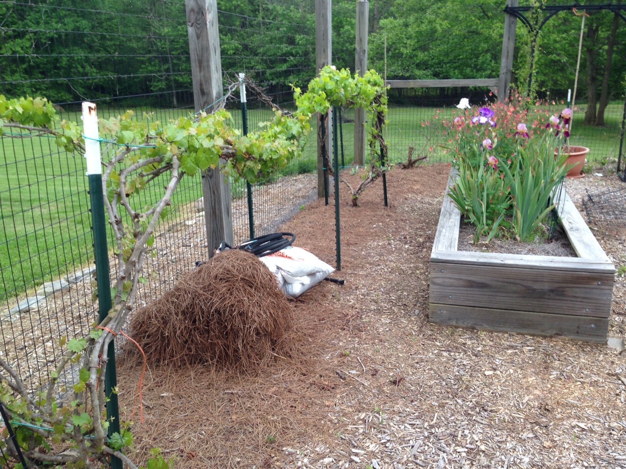 This is an early pic of the muscadine and scuppernong vines within the raised bed garden. The plants are about 5 years old and produce heavily in the early fall. We enjoy eating them fresh and make preserves to enjoy over the winter.