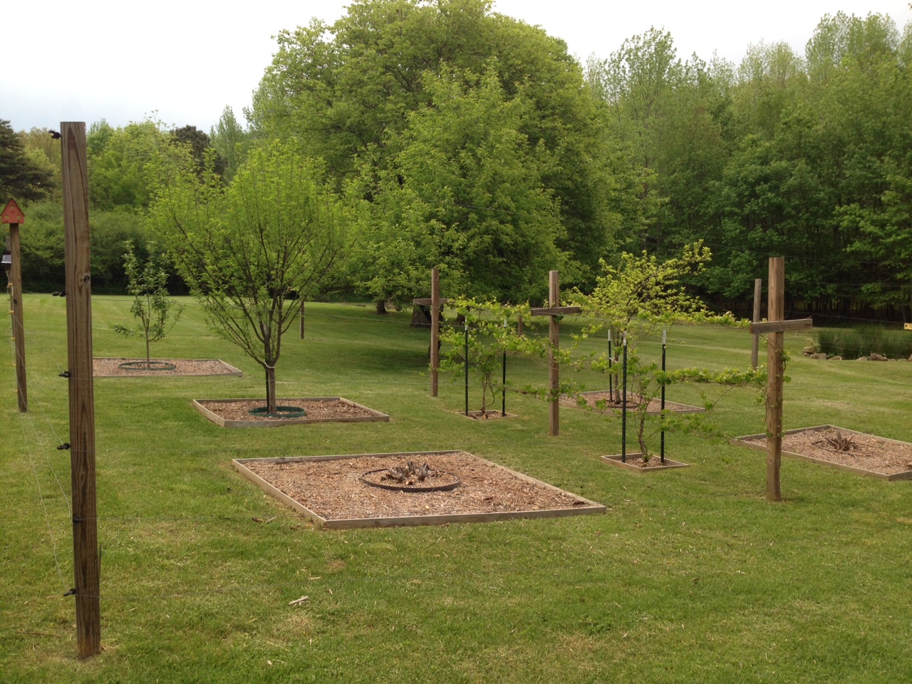 This little orchard contains figs (harsh winter … will come back from roots, but unlikely we will have fruit), muscadines, two varieties of plums and two varieties of apples. In the background are three Chinese Chestnut trees which will have a quite distinctive odor when they bloom late in the spring. The deer love the chestnuts as they are outside of our electric fence.
